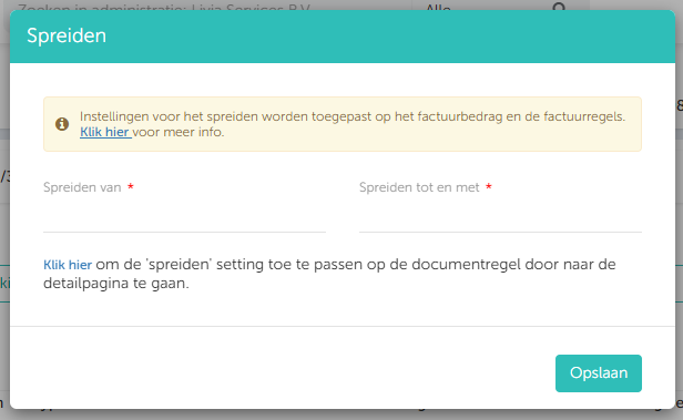 - Klik op Opslaan om de spreiding toe te passen op het factuur. Deze spreidingsperiode is ook van toepassing op alle factuurregels.